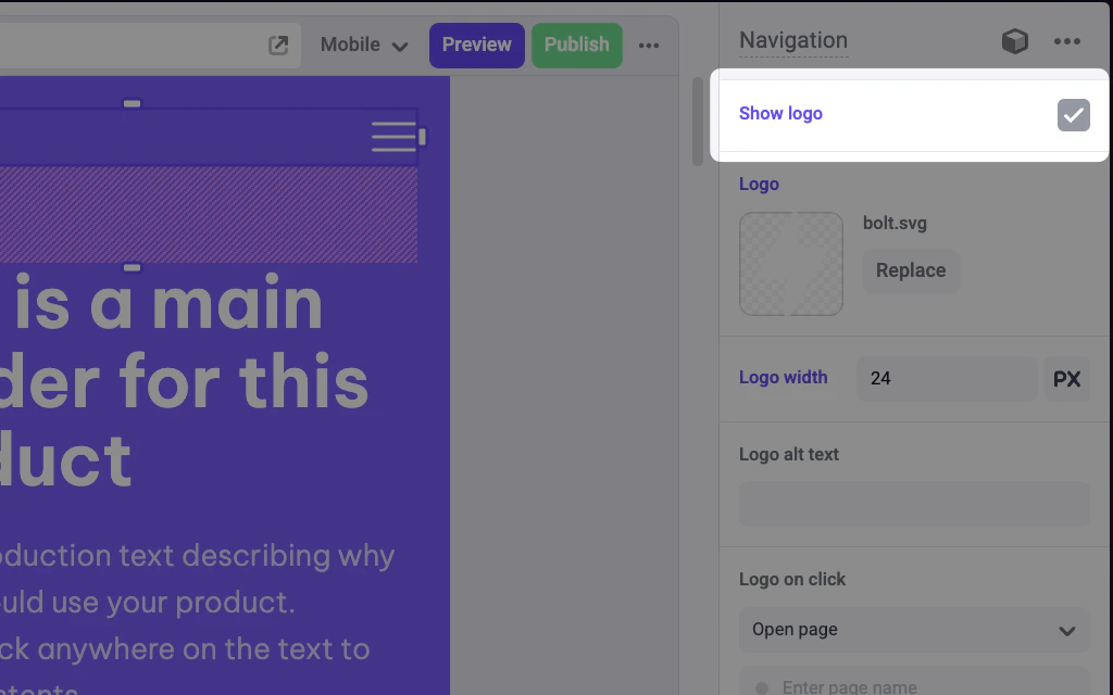 The following example adds a Checkbox control to theshowLogo prop of a Navigation component.